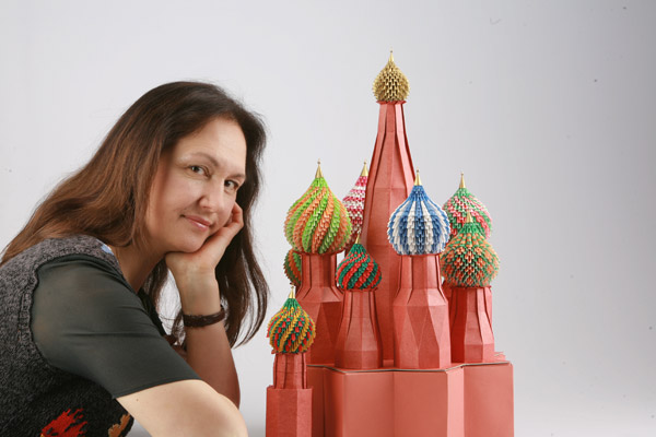 Statisch, ruhig, in seiner Form auf das Wesentliche reduziert und nicht zuletzt heiter steht Assia Brills Hauptwerk dieser Ausstellung neben dem Drachenkampf: Eine Papierminiatur der St.-Basilius-Kathedrale in Moskau. Die bunten Kuppeln der russischen Zuckerbäckerarchitektur hat sie in einer Art Artischockentechnik in Papier nachgeahmt. Sehr exakt ist eine Schuppe neben die andere gesetzt, so dass sich die charakteristischen Zwiebelhauben ergeben.