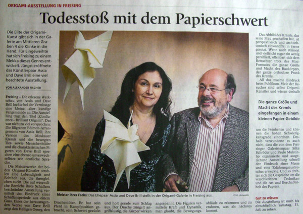 Unter dem Titel „Confluence“ stellt das russisch-britische Ehepaar Assia und Dave Brill ab 21. Mai 2010 in der Origami Galerie in Freising aus. Mit einem Querschnitt von traditionellen und experimentellen Werken aus den letzten 40 Jahren bieten sie einen umfassenden Einblick in ihr breit gefächertes Schaffen, das von klassischen Origami-Werken über ausgefallene Nassfaltungen bis hin zu romantischen Gemälden reicht.