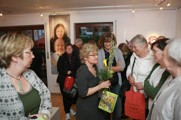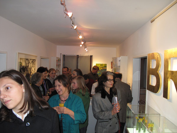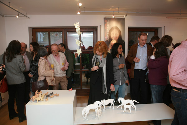 Unter dem Schriftzug sind zwei charakteristische Werke platziert. Assia Brills elegante, heitere „Daffodils“ (gelbe Narzissen) recken den Besuchern neugierig ihre Blütenköpfchen entgegen. Daneben steigt kraftvoll und dynamisch ein weißes Papierpferd auf, freistehend.